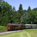 AB is the abbreviation for Appenzeller Bahnen. The plural form is justified, because since 1 January 1988 no fewer than 4 original railways have been united in one company. The Appenzellerbahn AB, formed in 1947 from the merger of the old Appenzellerbahn AB Gossau – Herisau – Appenzell and the Säntisbahn SB (since 1938 the Elektrische Bahn Appenzell – Weissbad – Wasserauen AWW) and the St. Gallen – Gais – Appenzell-Bahn SGA, formed in 1947 from the merger of the Appenzeller Strassenbahn ASt and the Altstätten – Gais-Bahn AG. Today, the AB still has an extensive park of nostalgic vehicles from the various founding railways, which really invite you to take a photo tour. This began with a trip in the AB’s diesel railcar BCFm 2/4 56 from 1929, which was purchased to supplement the steam locomotives and frequently ran trains on the neighbouring SB until 1949, which is why our special train carried two cars – the C 13 and C 14 – from the Säntis Railway. In Wasserauen we had the opportunity to admire the CFe 3/3 2 from 1911 of the former AG, which was recently restored on a private basis. Back in Appenzell, we changed to the historic SGA train with the BCFeh 4/4 5 with three two-axle units, which took us to Gais to the main workshop of the AB. At the end of the day, we travelled from Gais to Altstätten and back via Gais to St.Gallen in a catered historic passenger coach with timetable trains, where our journey ended.