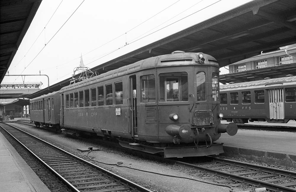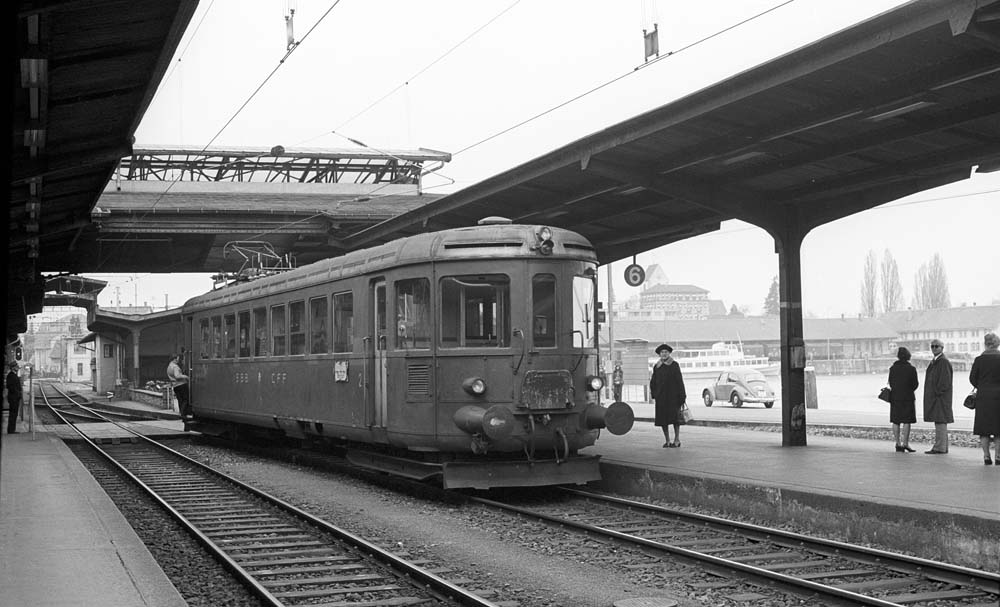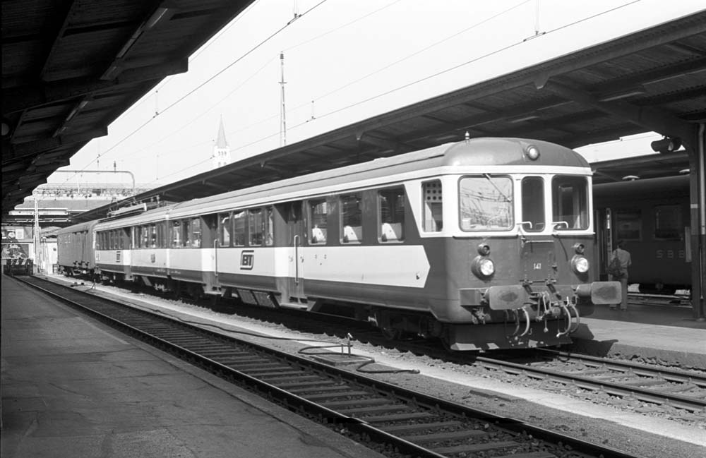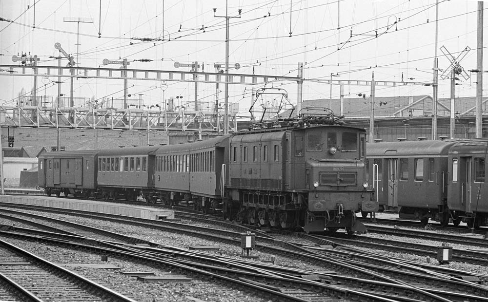 The ‘Jurapfeil’ RBe 2/4 1010 with its trailer car ABDi 50 85 81-03 001-4 is ready to depart back to Rorschach. The five lightweight ABD(i) aluminium carriages were built specifically for the Rote Pfeile trains, which were too small, and were used in Rorschach, Winterthur and the Seetal region at the time. Romanshorn, 23 March 1977 photo © Edi Meier, Bülach