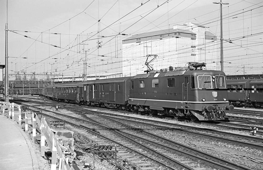 A little further towards Zurich we observe the Re 4/4 II 11348 with its long express train consisting of green EW I and II standard carriages. Behind the Re 4/4 II, one of the buildings of the port of Romanshorn can be seen. On the left is the mechanical signal box, which was still in full operation at the time, as evidenced by the many cable pulls at the bottom centre of the picture. Romanshorn, 31 March 1984 photo © Edi Meier, Bülach