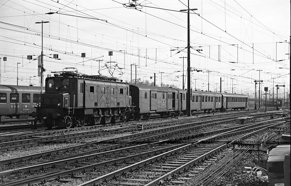 At Romanshorn, the last Ee 3/3 ‘Halbschuh’ locomotives with a single-sided front end from the first series of SBB electrical shunting locomotives were active. Here, Ee 3/3 no. 16324 is preparing an EW II luggage van for its next assignment. 31 March 1984 photo © Edi Meier, Bülach
