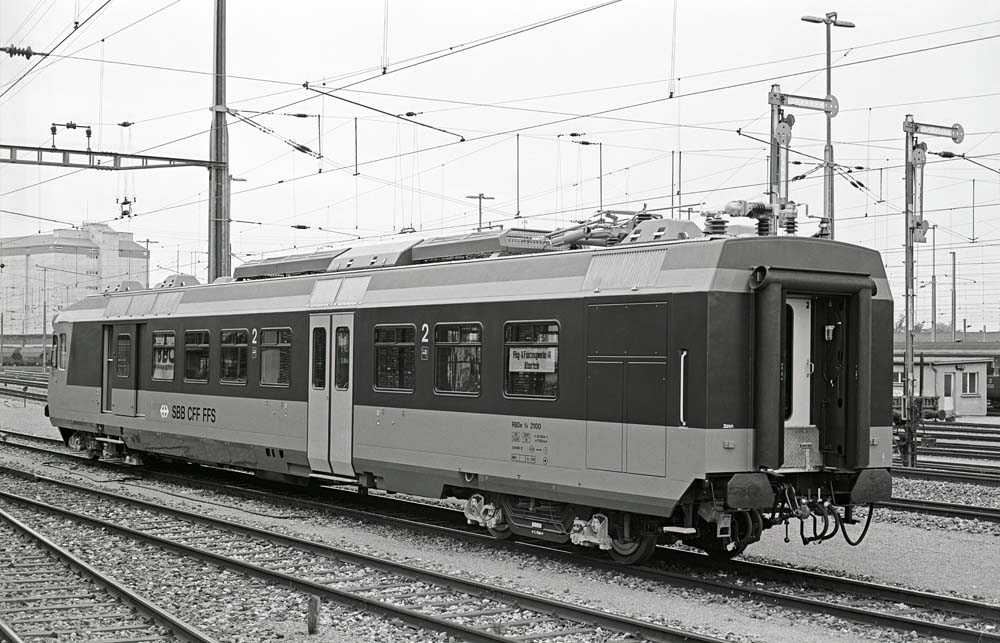 The rear of an NPZ railcar is a rare sight. During its transfer, we had the opportunity to photograph the NPZ prototype 2100. In the rear compartment window is an advertising sign from the manufacturer FFA Altenrhein. To the right of the NPZ are the two semaphores that are familiar from the entrance of the Ae 3/6 I. Romanshorn, 25 June 1984 photo © Edi Meier, Bülach