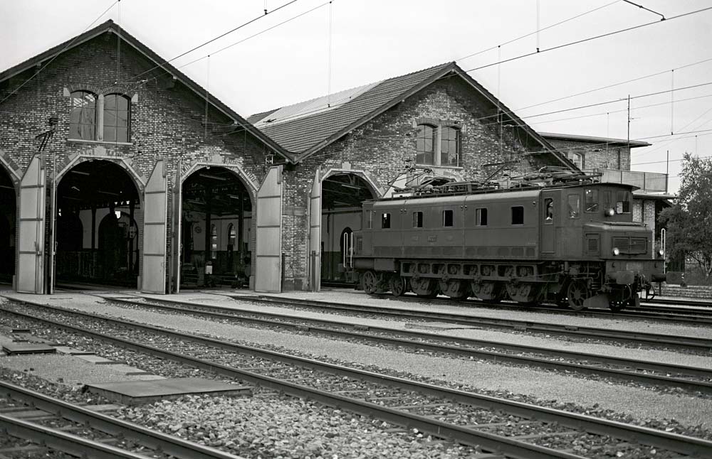 The Romanshorn locomotive shed, which now houses Locorama, was still fully operational in 1984. The Ae 4/7 11027, the last of the series, leaves the venerable brick building and sets off on its next assignment. Romanshorn, 31 March 1984 photo © Edi Meier, Bülach