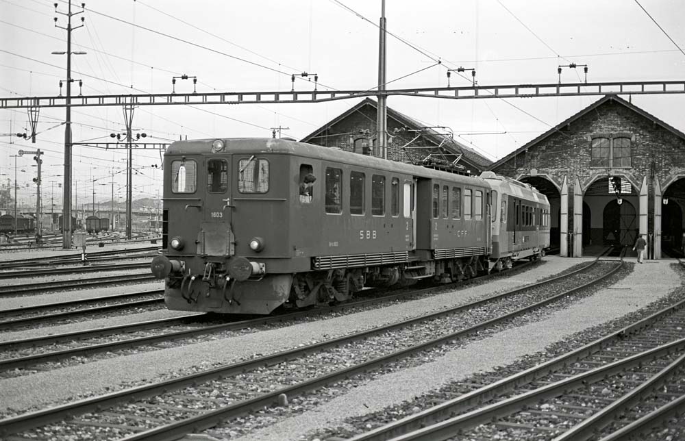 A rare guest at the Romanshorn depot was this Be 4/6 railcar no. 1603, which was used to haul its great-grandson, the NPZ prototype no. 2100. To the left of the Be 4/6 railcar, you can see the extensive Romanshorn marshalling yard, which, apart from the mechanical signals, has remained largely unchanged and now serves as a storage area for Intercity train reinforcement modules. Romanshorn, 25 June 1984 photo © Edi Meier, Bülach