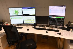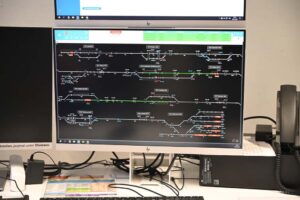 All vehicles communicate bidirectionally with the control computer. Each vehicle knows its current position to within a few metres. There are support points distributed along the route where the exact position is transmitted to the vehicle and the position calculation is reset to this value. In between, the position is calculated based on the number of wheel revolutions (which is not absolutely accurate, as the wheel diameter depends on wear and tear, and micro-slip or sliding also leads to deviations, hence the need for calibration points). The railway currently operates at GoA1 level, where everything is monitored and controlled by the master computer and the computers on the vehicles. Even shunting movements and routes requested by the train driver remain monitored. The train crews are enthusiastic about this support.
