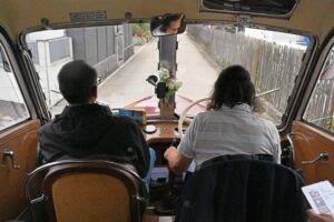 Our driver Kaspar Bechter and our tour guide Urs Berger in the cockpit of the Saurer bus at the start of the last leg of the journey to Olten. Many thanks to both of them for organising and carrying out this wonderful trip.