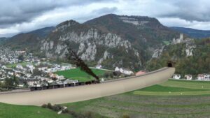 On the way to Mümliswil, there was a short stop above Balsthal. From this spot, there is a beautiful view over the valley, the Klus gorge opposite towards Mümliswil with the ruins of Neu Falkenstein Castle. Here, the railway would have crossed the valley on a 21-metre-high embankment and disappeared into a short tunnel next to the castle. The reason why the Klus was not crossed through the cutting was because the planners wanted to achieve wide radii and a moderate gradient.